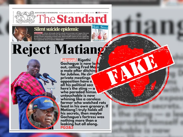 Apurado pelo site Africa Check 🇿🇦 EM RESUMO: Apenas dois dias após o político queniano e candidato à presidência Fred Matiang’i participar de uma conferência realizada pelo antigo partido governista do país, a primeira página de um jornal alegou que ele havia se desentendido com o ex-vice-presidente Rigathi Gachagua. No entanto, a primeira página foi… Continuar lendo Verificado: O ex-vice-presidente do Quênia, Gachagua, não chamou o político da oposição Matiang’i de toupeira – página inicial viral alterada