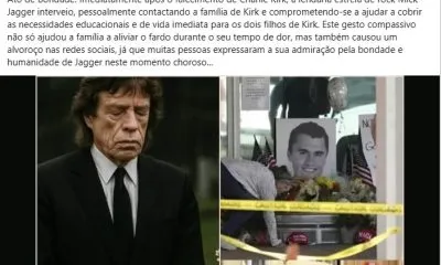 Apurado pelo site E-Farças Vocalista da banda The Rolling Stones teria interrompido show para homenagear ativista político assassinado, além de custear a edução de suas filhas! Será verdade? A alegação se espalhou nas redes sociais no final da segunda quinzena de setembro de 2025, dias depois do assassinato do ativista político norte-americano Charlie Kirk, no… Continuar lendo Falso: Mick Jagger homenageou Charlie Kirk em seu show e prometeu cuidar de suas órfãs?
