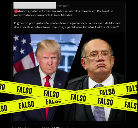 Apurado pelo site Lupa Circulam no TikTok, X e LinkedIn publicações de que a justiça de Portugal teria determinado o bloqueio de bens e investimentos do ministro Gilmar Mendes do Supremo Tribunal Federal (STF) a pedido dos Estados Unidos (EUA). É falso. Por meio do projeto de verificação de notícias, usuários do Facebook solicitaram que… Continuar lendo Falso: Justiça dos EUA não pediu bloqueio de bens de Gilmar Mendes em Portugal