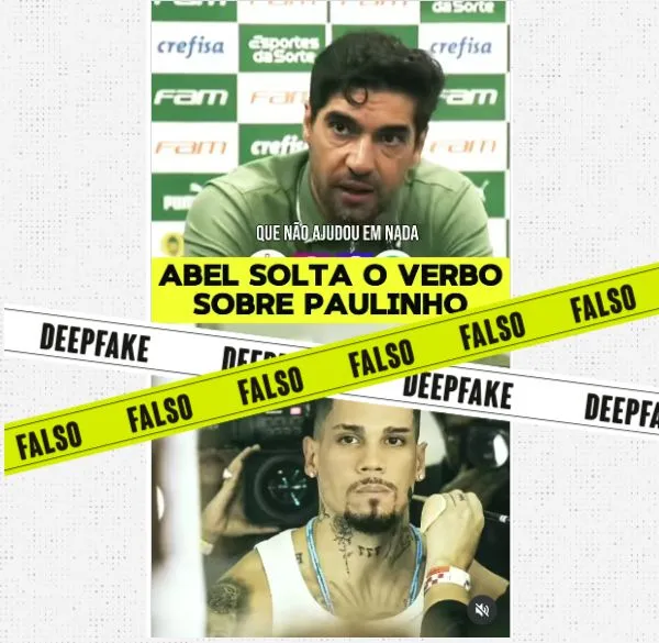 Apurado pelo site Lupa Circula no Instagram um vídeo que atribui ao técnico Abel Ferreira, do Palmeiras, uma suposta declaração sobre o camisa nove do time, Paulinho, durante uma coletiva de imprensa. Na publicação, o treinador alega que o jogador “não ajudou em nada” e faz críticas à participação do atacante no São Paulo Fashion… Continuar lendo Falso: É falso que Abel Ferreira criticou Paulinho e a sua religião