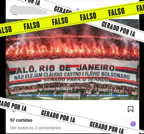 Apurado pelo site Lupa Circula no Facebook, Instagram e Threads uma imagem que mostra um bandeirão atribuído a torcida do Flamengo estendido na arquibancada do estádio durante um jogo, com pedido para que os cariocas não elejam Cláudio Castro e Flávio Bolsonaro para o Senado. É falso. A imagem foi gerada por inteligência artificial (IA). … Continuar lendo Falso: Imagem de bandeirão da torcida do Flamengo contra Claudio Castro e Flavio Bolsonaro foi gerado por IA