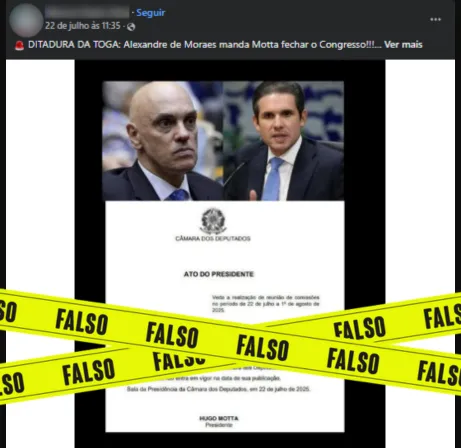 Apurado pelo site Lupa Circula no Facebook um post afirmando que o ministro do Supremo Tribunal Federal, Alexandre de Moraes, mandou Hugo Motta, presidente da Câmara dos Deputados, fechar o Congresso Nacional. É falso. Por WhatsApp, leitores sugeriram que o conteúdo fosse analisado. Confira a seguir o trabalho de verificação da Lupa: DITADURA DA TOGA:… Continuar lendo Falso: Moraes não mandou fechar o Congresso Nacional; Parlamento está em recesso