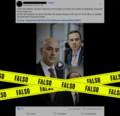 Apurado pelo site Lupa Um vídeo que circula no Facebook alega que os ministros do Supremo Tribunal Federal (STF), Luís Roberto Barroso e Alexandre de Moraes, se escondem em Roma com medo da Lei Magnitsky. É falso. Por meio do projeto de verificação de notícias, usuários do Facebook solicitaram que esse material fosse analisado. Confira… Continuar lendo Falso: Barroso e Moraes não fugiram para Roma para evitar a Lei Magnitsky