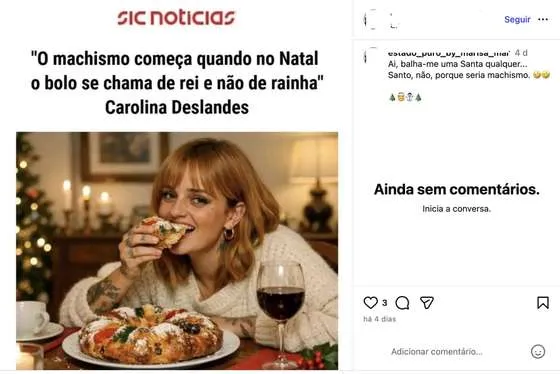 Apurado pelo site Observador 🇵🇹 Circula nas redes sociais uma suposta declaração de Carolina Deslandes em que a cantora associa o machismo ao Natal. Mas tanto a publicação como a imagem que a acompanha são falsas. Circula nas redes sociais uma suposta declaração de Carolina Deslandes em que a cantora associa o machismo ao Natal.… Continuar lendo Verificado: Deslandes disse que ‘machismo começa quando o bolo é rei’?