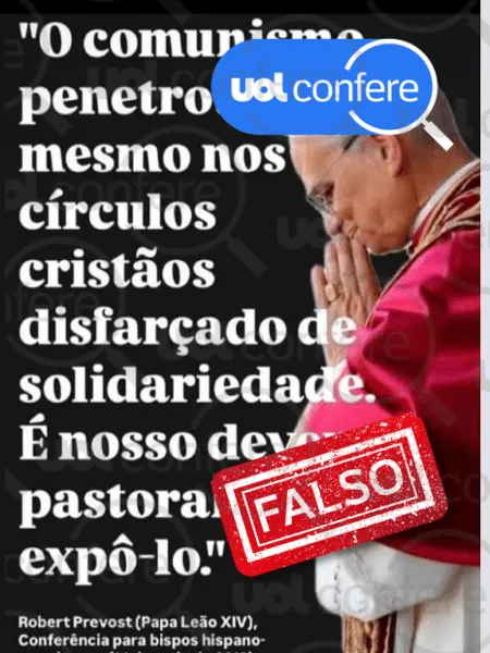Apurado pelo site UOL Confere É falsa uma citação atribuída ao papa Leão 14 nas redes sociais em que ele teria dito que “o comunismo penetrou nos círculos cristãos disfarçado de solidariedade”. Não há registro de que ele tenha dito isso, e a postagem enganosa usa uma referência para a suposta declaração que não existe.… Continuar lendo Falso: Papa Leão 14 não disse que o ‘comunismo penetrou nos círculos cristãos’