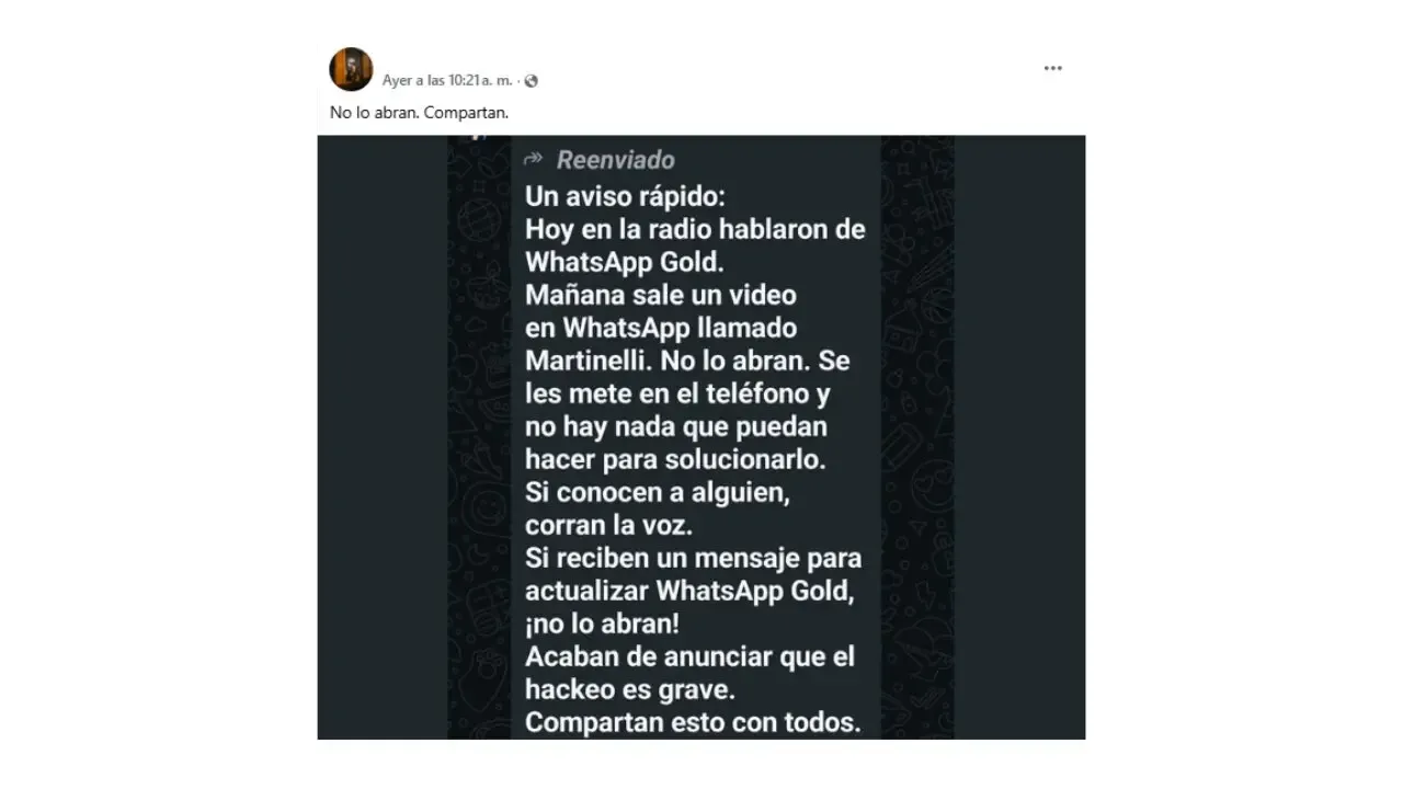 Circula no WhatsApp uma corrente alertando sobre o “WhatsApp Gold” e um vídeo chamado “Martinelli”, que contém um vírus. “Hoje no rádio falaram sobre o WhatsApp Gold. Amanhã vão postar um vídeo no WhatsApp chamado ‘Martinelli’. Não abra. Ele entrou no seu celular e nada que você fizer vai resolver”, diz a mensagem viral.