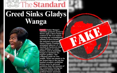 RESUMINDO: Uma capa que imita o design do jornal queniano Standard descreve a governadora do Quênia, Gladys Wanga, como alguém com “ganância implacável pelo poder”. No entanto, essa é apenas uma das muitas capas fabricadas com o objetivo de difamar políticos quenianos proeminentes.