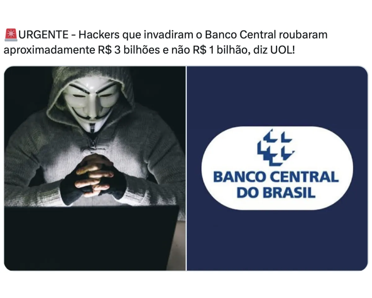 Publicações nas redes enganam ao afirmar que o Banco Central sofreu uma invasão hacker que teria roubado cerca de R$ 3 bilhões de suas contas de reserva. Em nota, a instituição afirmou que “os sistemas administrados pelo BC não foram afetados” e que o alvo do ataque foi uma empresa terceirizada que fornece tecnologia a instituições financeiras.