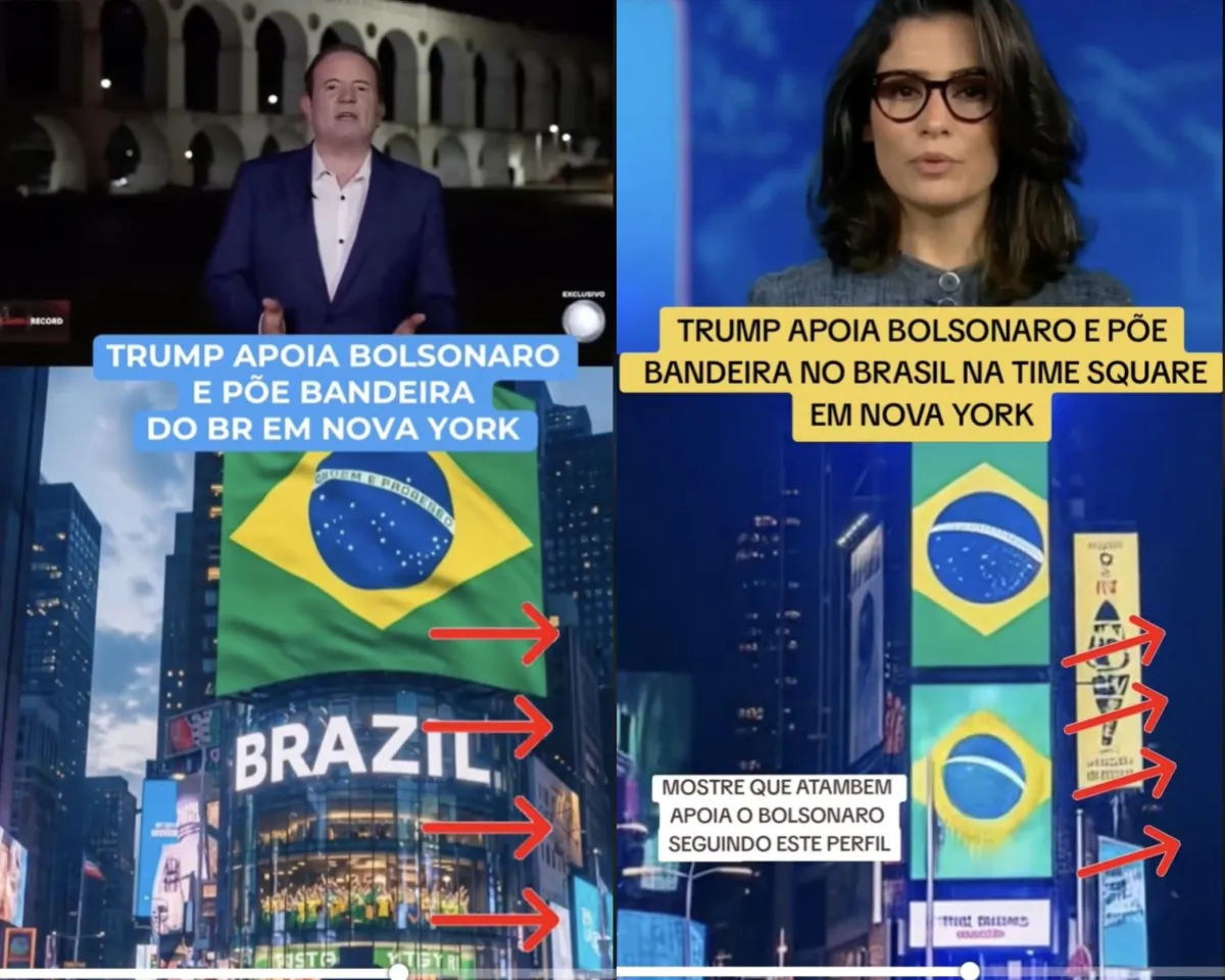 Posts nas redes compartilham vídeos gerados por IA para fazer crer que os jornalistas Roberto Cabrini e Renata Vasconcellos — respectivamente da Record e da Globo — teriam noticiado que bandeiras do Brasil foram projetadas em telões na Times Square, em Nova York, a pedido do presidente Donald Trump, para demonstrar apoio ao ex-presidente Jair Bolsonaro.