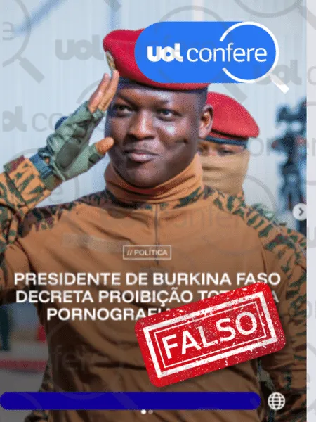 “Presidente de Burkina Faso decreta proibição total da pornografia no país”, diz o texto da publicação, sobreposto a uma foto do presidente burquinense Ibrahim Traoré.