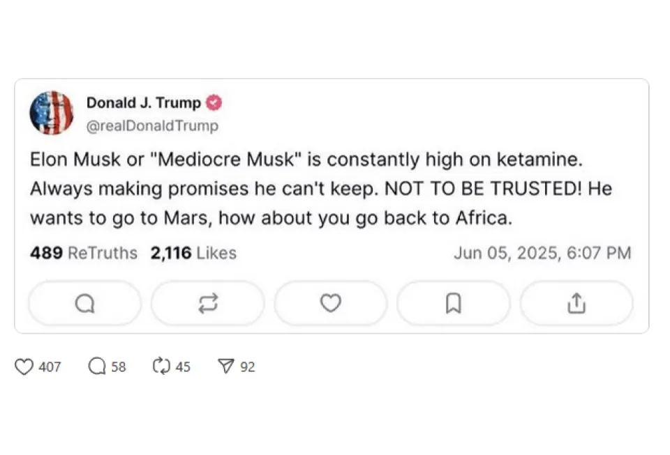 Não é verdade que o presidente dos Estados Unidos, Donald Trump, afirmou em post nas redes que o empresário Elon Musk está sempre drogado e que ele deveria voltar para a África. Aos Fatos não encontrou registros públicos que atestem que o republicano tenha dado tal declaração.