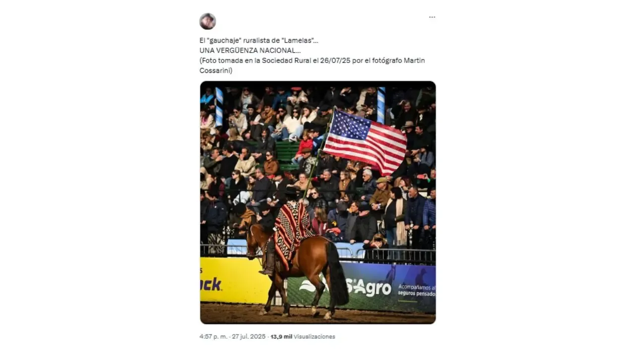Uma foto de um gaúcho carregando uma bandeira dos Estados Unidos na abertura da 137ª Exposição Rural está circulando no X. “O ‘gauchaje’ ruralista de ‘Lamelas’… UMA VERGONHA NACIONAL…” dizem algumas postagens, que têm mais de 13.000 visualizações no X.