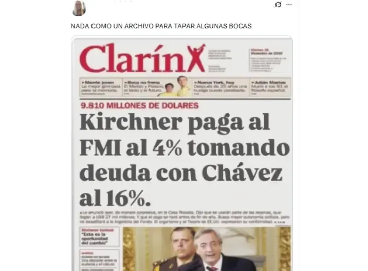 Circula nas redes sociais uma imagem de uma suposta capa do jornal Clarín, que afirma que o ex-presidente Néstor Kirchner (Frente para la Victoria) cancelou sua dívida com o Fundo Monetário Internacional (FMI) tomando dinheiro emprestado da Venezuela a uma taxa muito mais alta.