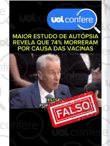No vídeo ele diz que “desses casos que chegaram para autópsia após a vacinação, em 73,9% dos indivíduos, foi determinado que a vacina foi a causa da morte”.