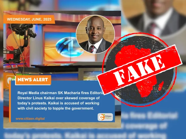 EM RESUMO: Um gráfico viral afirma que o presidente da Royal Media Services, SK Macharia, demitiu Linus Kaikai, diretor editorial da Citizen TV. No entanto, o canal informou ao Africa Check que isso não aconteceu.