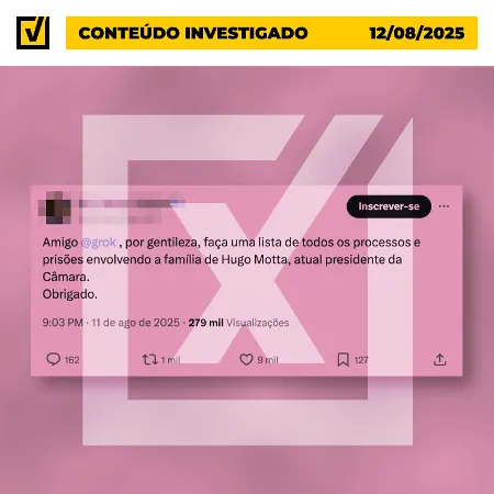 Um post no X desinforma ao citar processos envolvendo parentes próximos do presidente da Câmara dos Deputados, Hugo Motta. O autor da publicação ativou o Grok, inteligência artificial do X, para solicitar uma “lista de todos os processos e prisões envolvendo a família” do parlamentar. Na resposta, a plataforma responde apontando casos envolvendo o pai, a mãe, a avó, o ex-cunhado e o padrasto do político.