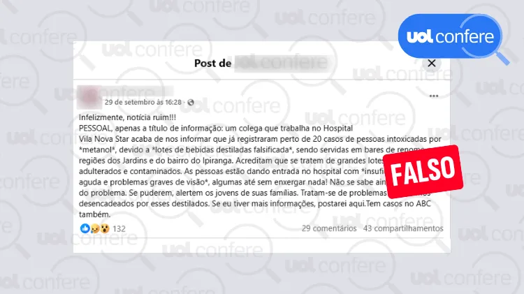 Hospital negou que tenha registrado casos de intoxicação por metanol. “O Hospital Vila Nova Star informa que não possui pacientes em atendimento com quadros relacionados à intoxicação por metanol”, afirmou a instituição em nota ao UOL Confere.