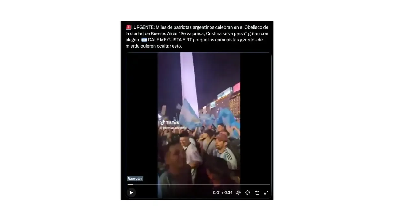 No entanto, isso é falso. O vídeo não é atual, mas circula desde novembro de 2023, após a vitória de Javier Milei (La Libertad Avanza) nas eleições presidenciais. Além disso, a música apresentada no vídeo viral, onde se ouvem pessoas cantando “Cristina se va presa” (Cristina vai para a cadeia), também era cantada naquela época, como evidenciado por diversos vídeos que circularam nas redes sociais…
