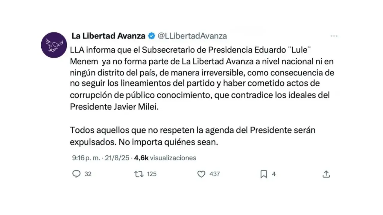 Circula nas redes sociais uma imagem de uma suposta declaração de La Libertad Avanza (LLA) em X, na qual é anunciada a expulsão de Eduardo “Lule” Menem do partido, após a polêmica sobre denúncias de suborno na compra de medicamentos pela Agência Nacional de Deficiência (ANDIS).