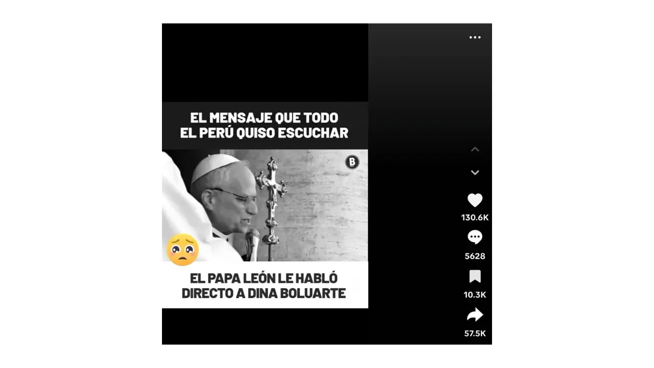Está circulando nas redes sociais um vídeo do Papa Leão XIV , no qual ele supostamente se dirige à presidente peruana Dina Boluarte, pedindo que ela “reflita” e “se afaste”.