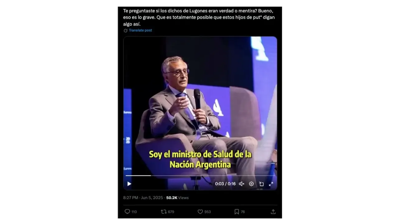 Circula um vídeo do Ministro da Saúde, Mario Lugones, no qual ele supostamente diz: “Eu não administro emoções, eu administro números”. No entanto, é falso. O vídeo foi gerado por inteligência artificial e mostra sinais claros de manipulação, como dessincronização entre sua voz e lábios.