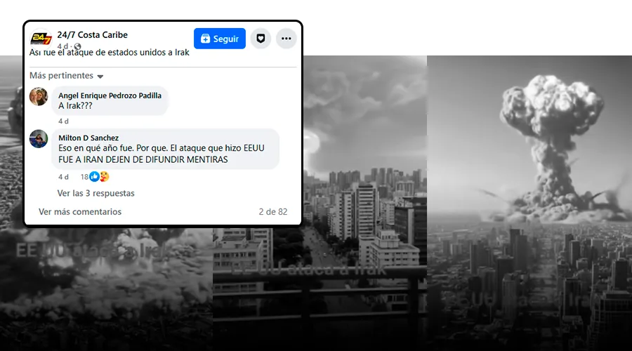 A conta do Facebook “24/7 Costa Caribe” publicou um vídeo intitulado ” Este foi o ataque dos Estados Unidos ao Iraque ” (sic), que mostra uma sequência de quatro clipes com nuvens de fumaça em forma de cogumelo, comumente associadas ao aparecimento de explosões nucleares, em paisagens urbanas. A publicação, que acumulou mais de 90.000 visualizações, circula desde 22 de junho, um dia após os bombardeios americanos às instalações iranianas em Fordow, Natanz e Isfahan, embora diga erroneamente “Iraque”.