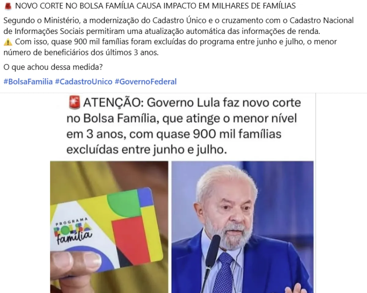 Publicações enganam ao afirmar que o governo Lula cortou o Bolsa Família de mais de 900 mil famílias entre junho e julho deste ano. Na verdade, os beneficiários deixaram o programa porque passaram a ter renda acima do limite permitido e, por isso, foram desenquadradas do benefício, como já previa a regra em vigor antes mesmo de quaisquer mudanças.