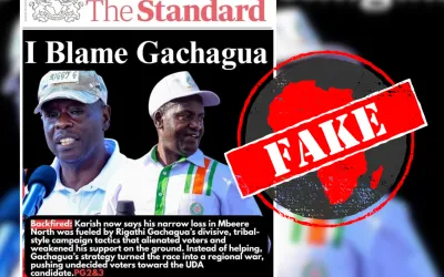 RESUMINDO: Uma manchete criada para imitar a do jornal queniano Standard afirma que Newton Kariuki, segundo colocado na eleição suplementar para o parlamento em Mbeere Norte, culpou o ex-vice-presidente Rigathi Gachagua por sua derrota. No entanto, a manchete é falsa.