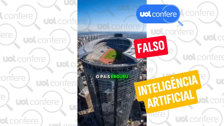 Vídeo contém imagens geradas por IA. O UOL Confere submeteu o conteúdo compartilhado pelas peças enganosas à análise do Sight Engine, especializado na identificação de adulterações digitais em imagens. A ferramenta apontou 97% de probabilidade de a suposta imagem do estádio no topo de um arranha-céu ter sido criada com o auxílio de ferramentas de inteligência artificial (abaixo)…