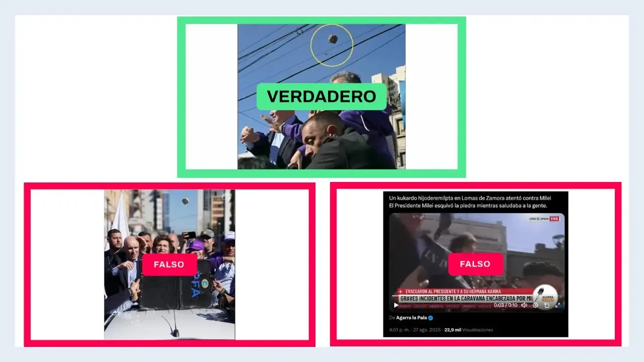Fotos e vídeos falsos e reais estão circulando nas redes sociais sobre o ataque ao presidente Javier Milei durante a caravana La Libertad Avanza em Lomas de Zamora em 27 de agosto.