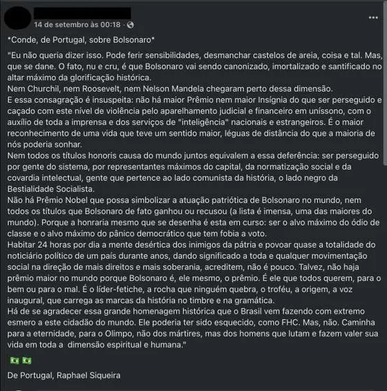 É mesmo estabelecida uma comparação com líderes históricos como Winston Churchill, Franklin Roosevelt ou Nelson Mandela, para concluir que nenhum deles “chegaram perto” da “dimensão” de Bolsonaro. Refere ainda que há um “aparelhamento judicial e financeiro” que “persegue” o ex-presidente, que ainda este mês foi condenado pelo Supremo Tribunal Federal do Brasil por tentativa de golpe de Estado. A única autoria referida surge logo à cabeça: “Conde, de Portugal, sobre Bolsonaro”.