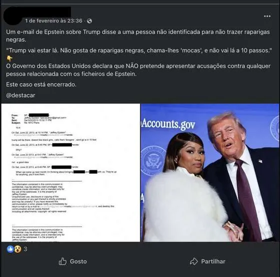 Alegado email enviado por Jeffrey Epstein a alguém não identificado sugere que Donald Trump não quis incluir “raparigas negras” em planos, porque “não gostava delas”. Será mesmo assim?