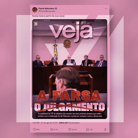 Na rede social X, Flávio Bolsonaro compartilhou a capa adulterada sob a legenda: “Numa banca perto da sua casa”. Já no Instagram, o senador escreveu a legenda: “A História mostrará quem acabou com a democracia no Brasil. Deixe aqui seu comentário”…
