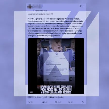 Conteúdo investigado: Posts dizendo que o ministro da Justiça, Ricardo Lewandowski, teria mentido ao dizer que não negou pedido de apoio do governo do Rio de Janeiro em relação à megaoperação que deixou 121 mortos na capital fluminense.