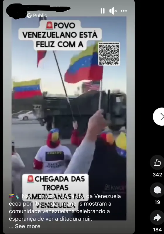 Utilizadores do Facebook e Instagram estão a partilhar um vídeo que alegadamente mostra venezuelanos em festa com a chegada das tropas dos EUA à Venezuela. Mas as imagens foram gravadas na Florida.