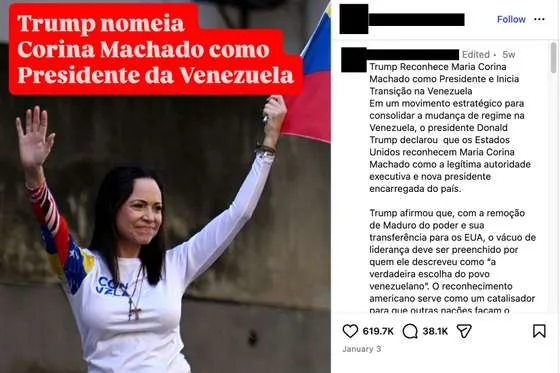 Logo no dia 3 de janeiro, começou a circular no Facebook e no Instagram o rumor de que Donald Trump iria reconhecer María Corina Machado, o rosto da oposição venezuelana ao regime de Maduro, como Presidente interina do país.