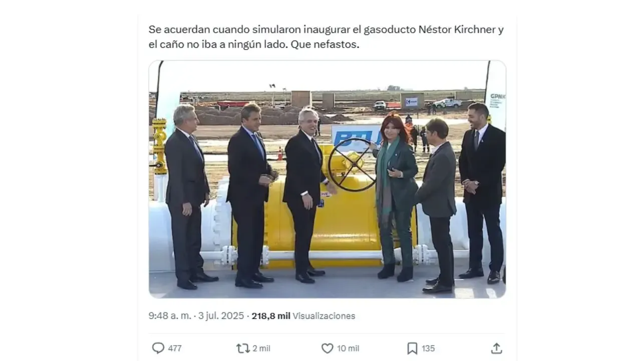 “Lembram quando fingiram inaugurar o gasoduto Néstor Kirchner e o gasoduto não chegou a lugar nenhum? Que desastre”, diz uma publicação no X com uma foto do ex-presidente Alberto Fernández e da ex-vice-presidente Cristina Fernández de Kirchner, ao lado de uma válvula do gasoduto.