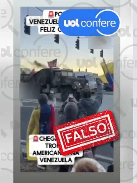 Um vídeo mostra dezenas de pessoas à beira de uma via movimentada. Elas comemoram, balançam várias bandeiras da Venezuela e filmam a passagem de um veículo militar, que ostenta bandeiras dos EUA e da Venezuela. Não há qualquer referência sobre o local ou a data onde as cenas se passaram.