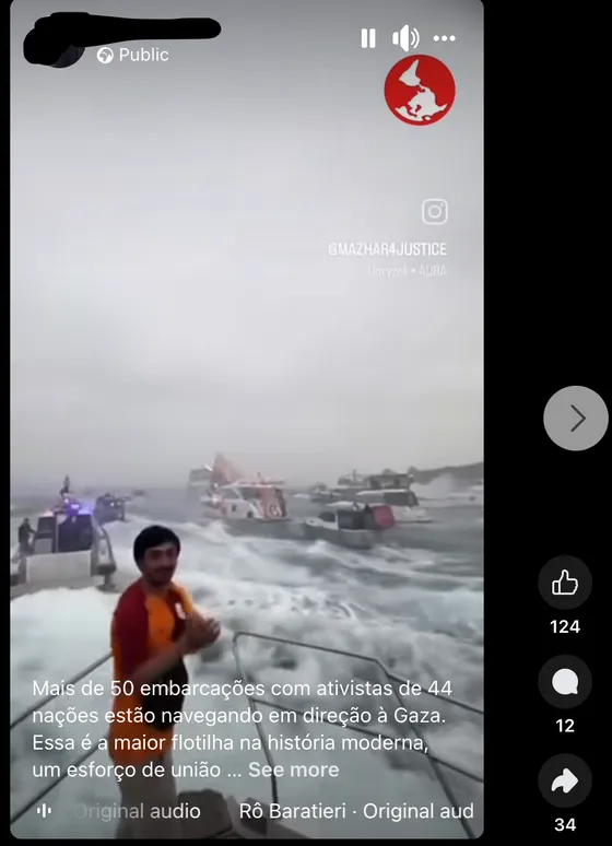 Várias publicações que circulam na rede social Facebook mostram o que alegam ser imagens da viagem da flotilha que se dirigia para a Faixa de Gaza, com o objetivo de entregar ajuda humanitária à população do enclave. “Mais de 50 embarcações com ativistas de 44 nações estão navegando em direção a Gaza. Essa é a maior flotilha na história moderna, um esforço de união para desafiar o cerco e trazer esperança ao povo palestino. PALESTINA LIVRE JÁ!!!”, lê-se numa das publicações.